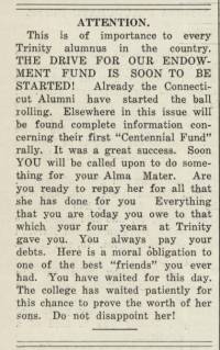 Throughout 1921, the Trinity Tripod chronicled the first phase of the fundraising efforts and every issue of the Tripod during that year was sent out to alumni, whether they were subscribed to the paper or not, to keep them informed of the progress of the drive and to encourage their contribution to the cause. A supplemental Tripod issue published in April 1921 focused heavily on the centennial drive and urgently appealed to its alumni readers to chip in. Trinity’s undergraduates were also mobilized towards centennial fundraising. On May 23, 1921, the entirety of the undergraduate student body pledged support for the Centennial Fund Campaign. During this meeting, Harold T. Slattery was elected chairman of a committee to solicit subscriptions from undergraduates towards the Fund.