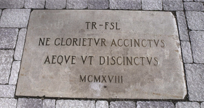 Roosevelt arrived at Trinity just before 1918 Commencement; he was invited partly as a result of the friendship between then ex-President Roosevelt and President Luther (the two had previously beeen involved with the Progressive Wing of the Republican party). On June 16, Roosevelt gave his speech at an open-air ceremony of over 5,000 attendees. The speech focused on World War I, urging support and patriotism while warning of boastful attitudes on the home front not followed by action abroad. He used the aforementioned Bible quote in his address, hence its inclusion on the plaque.