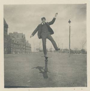Trinity student standing on the 1872 sundial, based on descriptions of its location. There are no other known images of the sundial. Photo credit: Trinity College Archives